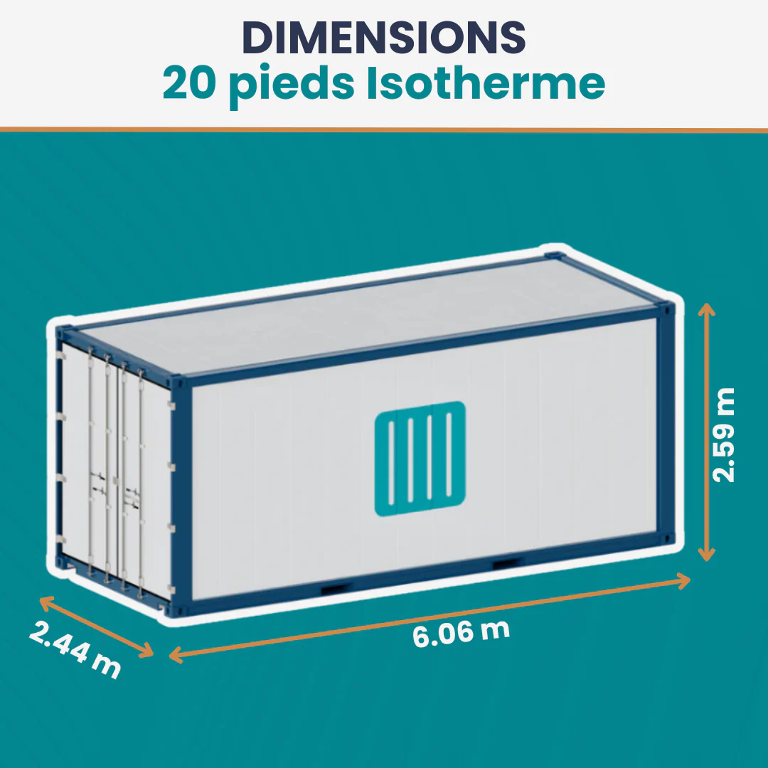 The 20-foot DRY insulated container is an economical and efficient alternative to an active refrigerated container. It is a converted reefer container from which the refrigeration unit has been removed and replaced with a high-performance insulated panel . Thanks to its 70 mm thick polyurethane walls, it offers optimal thermal insulation for storing your sensitive goods, even without a power supply.